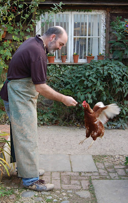 This hen is ridiculously tame and has learned to turn up at lunch time, keeping a beady eye on our sandwiches and doing tricks in return for a crumb or two. I'm getting rather fond of her, so the fox is bound to get her soon.
