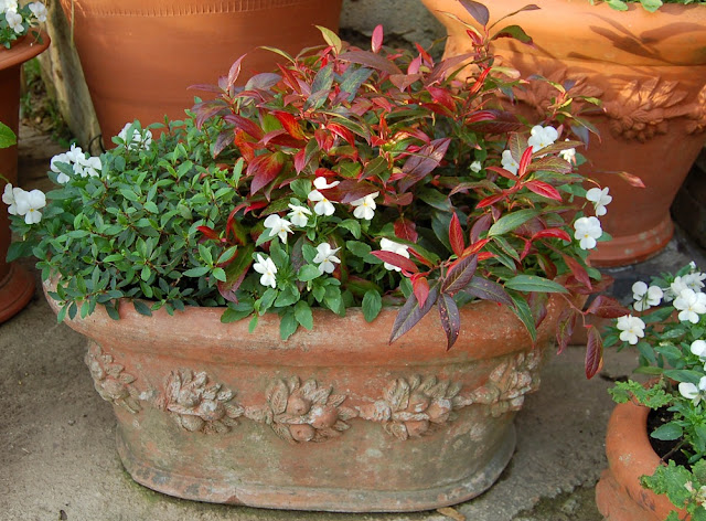 Ready for winter: Parahebe catarractae, Viola 'Sorbet White', Leucothoe 'Scarletta'.