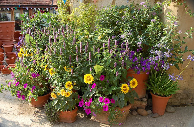 But I digress - BNC is a good example of pots being used to supplement limited growing room - they can be moved when the space is needed for something else, they frame doorways nicely and provide some softness and colour against all that lovely golden stone.