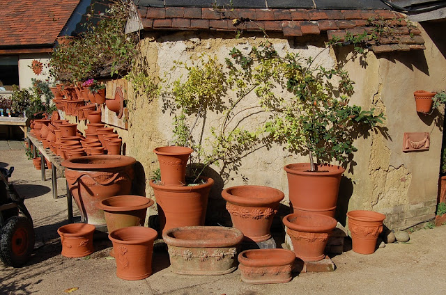 Once the plants had been removed I changed a few of the pots - choosing some with tulip decoration or Christmassy wreaths for winter. I will keep the chunky garland ovals where they are because they are handy on this corner as they don't stick out as much as round pots would. This wall is directly opposite the doors to the pottery and large trolleys bearing freshly-fired pots from the kilns have to be manoeuvred round the corner - if I take up too much space with plantings I get complaints from Joe, Riv and Chris! The vine pot on the far right probably sticks out a little too much but I have deliberately used a small pot there so that it can be moved easily if necessary.