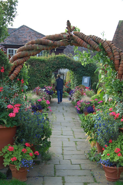 | A colourful greeting still - the entrance path to Whichford Pottery |