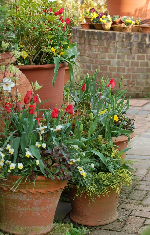 I was asked a question which had also come up at the bulb sale. Because I usually recommend planting other plants above bulbs I was asked if there are any plants I would not use above bulbs. The answer is not simple because it depends on the depth the bulbs need planting at, their eventual flowering height and the eventual height of the plant you are using. But for now let's just consider the larger tulips, which need planting about 6-8" deep: a wide range of bedding, perennials and shrubs are fine for planting over tulips as there is plenty of room for a one or two-litre rootball above them. Tulips will find their way through or around most plants but I would avoid putting them directly below really dense rootballs such as those of ferns, phormiums or pot-bound shrubs - you can put them really close to them, however.