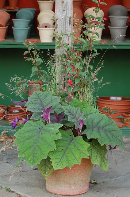 Another plant Henry VIII might have identified with is Solanum quitoense. Its massive violet-veined green leaves backed with more purple velvet have a rigid, regal bearing and if you aren't careful will completely overshadow, if not crush, neighbouring plants. It is one of the most asked-about plants at the pottery. I am determined to succeed in overwintering it this year, having grown it from seed three years in a row only to lose it. This time I have only planted out three and kept about half a dozen in the greenhouse so that they do not have to be transplanted just before the temperature drops.