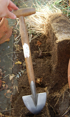 Leymus arenarius filling it so I spent a while levering it out. Luckily the larger sizes of our pots have drainage holes big enough to push your hand through when evicting plants, even so I managed to get a painful poke in the eye while wrestling with it. I got my revenge by chopping this vigorous blue grass into pieces with my favourite Sneerboer tool, so that it can be recycled into various winter plantings. We sell Sneeboer tools at the Pottery; this little spade (I think they call it a Perennial Spade) is intended for splitting plants and does the job magnificently because it has a very sharp, straight blade. It also has a short handle so is perfect for using in pots.