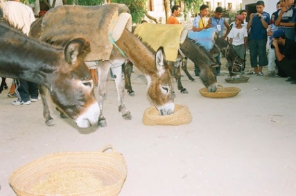 ما يستحق الذكر أنه ذاع صيت «مهرجان بني عمار الثقافي» على الرغم من ميزانيته المتواضعة، وتنظيمه في بلدة بعيدة عن المراكز الثقافية والمدن الكبرى، مثل مراكش وفاس وطنجة وأغادير والدار البيضاء والرباط، وذلك بسبب اهتمامه، في بادرة غير مسبوقة، بالحمير. ومن ثم، ساد انطباع خاطئ بأن المهرجان في دورته العاشرة هذا العام اكتسب أهميته من برمجة المنظمين فقرة «كرنفال الحمير»، التي تتضمن مسابقات مثل «أسرع حمار» و«أجمل حمار» و«الحمار الأكول» و«ترويض الحمار» و«أهزل حمار». خلال «كرنفال الحمير» في العام الماضي حجبت مسابقة «أجمل أتان (أي حمارة)» لعدم وجود «متسابقات» في المنطقة، في حين جرت مسابقة «أجمل حمار» وفق ضوابط وضعتها لجنة التحكيم، من بينها بنية الحمار وسلامته الجسدية، وسهولة ترويضه، فضلا عن الإكسسوارات والتزيين. وأسفرت المسابقة عن فوز الحمار «بيوض» بعد حصوله على 230 نقطة، ليفوز بمبلغ مالي قدره 2500 درهم (نحو 300 دولار أميركي) إلى جانب كيس من الشعير ودرع المهرجان. في حين احتل المرتبة الثانية الحمار «ميسي»، بعد حصوله على 222.5 نقطة، كاسبا مبلغ 1500 درهم (نحو 180 دولارا) وكيسا من الشعير، وجاء في المرتبة الثالثة الحمار «مربوح»، بعد حصوله على 213 نقطة، واستحق جائزة مالية مقدارها ألف درهم (نحو 120 دولارا). وتابع بلمو قائلا «إن المهرجان يحاول أن يوصل، في كل دورة، رسالة إلى الجمهور الواسع عبر الإشعاع الإعلامي المطرد، مفادها أن الاحتفاء بالحمار ليس نزوة أو قلة شغل، بقدر ما هو دعوة جدية إلى وقف تبخيس طاقاتنا وهدر إمكانياتنا وتهميش كفاءاتنا ونكران قيمة مكونات مجالنا البيئية والبشرية». |