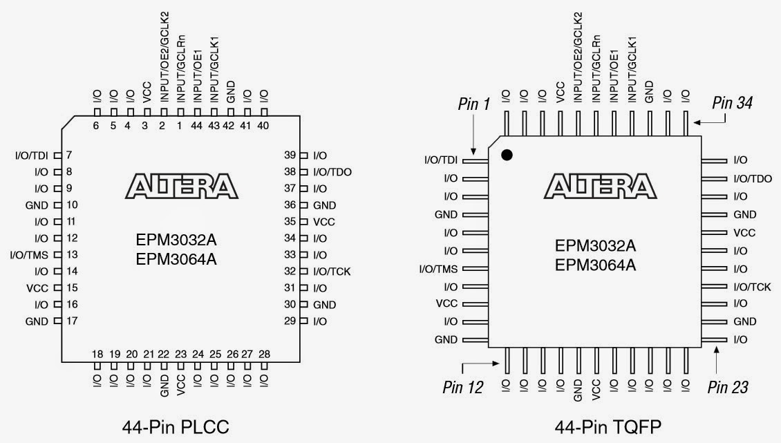Após algum tempo investigando o porque eu percebi que cometi um erro grave. O tempo todo que eu testei o circuito no protoboard eu usei o CPLD EPM3064 versão PLCC 44 pinos. Quando eu desenvolvi a placa eu resolvi usar a versão TQFP 44 pinos do mesmo chip. Sendo que, apesar de fisicamente a posição dos sinais em ambos os chips ser rigorosamente a mesma a forma como os pinos são contados em um encapsulamento e no outro são diferentes conforme podemos ver na imagem abaixo.