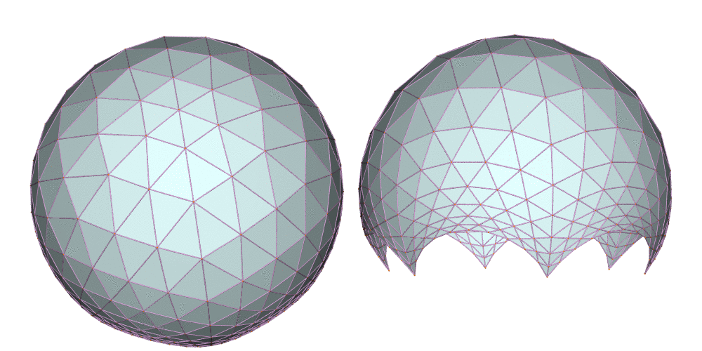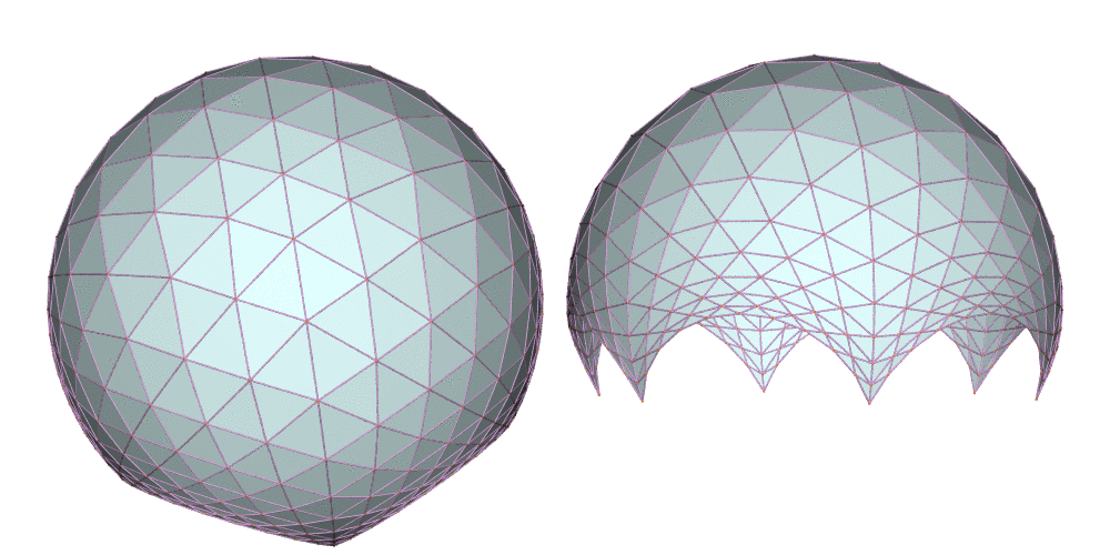 These are "low-frequency" domes -- just 3 to 6 rows of triangles. But I'm currently doing calcs for domes up to 16 rows, and (probably) a choice of 4 to 8 triangles converging at the dome apex.