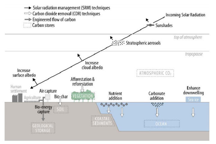 Parry, I., Ritchie, P., Boucher, O., Cox, P., Haywood, J., Niemeier, U., ... & Visioni, D. (2024). Solar Radiation Modification is projected to increase land carbon storage and to protect the Amazon rainforest. Abstract Solar radiation modification (SRM) aims to artificially cool the Earth, counteracting warming from anthropogenic greenhouse gases by increasing the reflection of incoming sunlight. One SRM strategy is stratospheric aerosol injection (SAI), which mimics explosive volcanoes by injecting aerosols into the stratosphere. There are concerns that SAI could suppress vegetation productivity by reducing the amount of sunlight reaching the Earth’s surface and by shifting rainfall patterns. Here we examine results from five Earth System Models that use SAI to reduce the global mean temperature from that of a high emissions world (SSP585), to that of a more moderate global warming scenario (SSP245). Compared to SSP245, the SAI simulations project higher global NPP values (+15.6%) and higher land carbon storage (+5.9%), primarily because of increased CO2 fertilization. The effects of SAI are most obvious in Amazonia where notable increases in NPP (+13.8%) and land carbon storage (+8.6%) are projected compared to SSP245, as well as compared to SSP585 (+10.8% and +7.1% respectively). Our results therefore suggest that SAI could provide some protection against the risk of climate change induced Amazon forest dieback, and may in fact be a very effective method of atmospheric carbon sequestration.