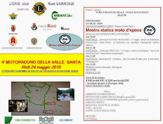 Motoraduno Rieti città - Valle Santa - 24 MAGGIO 2015 Posted: 25 Apr 2015 02:00 AM PDT Buongiorno Carissimi In questi ultimi tempi fa da padrone lo svago, l'interesse comune per i viaggi in Moto, le visite nelle città artistiche, cullandosi per le curve delle nostre strade, ed il convivio gastronomico, in modo che siano la reale opportunità per vivere al meglio la propria passione della moto vi invitiamo al Motoraduno del 24 MAGGIO 2015 a Rieti – giro della Valle Santa .
