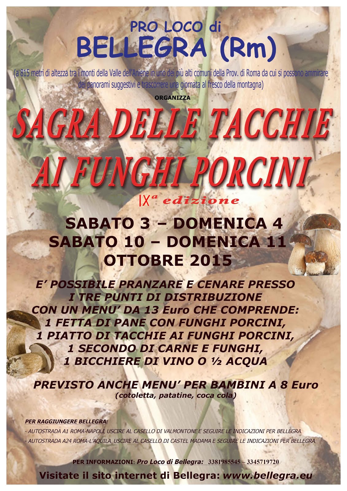 SAGRA DELLE TACCHIE AI FUNGHI PORCINI 2015 Posted: 11 Sep 2015 03:58 AM PDT Salve, l'Associazione Pro Loco di Bellegra, un Paese situato nella Provincia di Roma organizza la nona edizione della "Sagra delle tacchie ai funghi porcini" che si terrà a Bellegra (Rm) nei seguenti giorni: