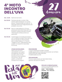Posted: 02 Sep 2015 06:03 AM PDT Siamo lieti di invitare il Vs. Motoclub o Associazione e tutti i Vs. soci al 4° MOTOINCONTRO DELL'UVA che si terrà a Montefelcino - Prov. di Pesaro e Urbino durante la Festa dell'Uva il giorno 27 settembre 2015. Visto il grande successo dello scorso anno e la riuscita della Festa dell'Uva giunta ormai alla 9° edizione abbiamo deciso di allargarci ed estendere l'invito anche ai bikers delle regioni a noi più vicine. PROGRAMMA e LOCANDINA: DOMENICA 27 SETTEMBRE Ore 8.00: Apertura iscrizioni Ore 10.00: Partenza del giro turistico "Alla pendici della Carpegna" con sosta presso "l'Azienda Agricola Valturio" a Macerata Feltria con degustazione dei prodotti, vino e olio; Ore 13.00: Ritorno a Montefelcino e Pranzo libero presso gli stand della Festa dell'Uva durante il quale avverranno le varie "Premiazioni ai Motociclisti e ai Motoclub"