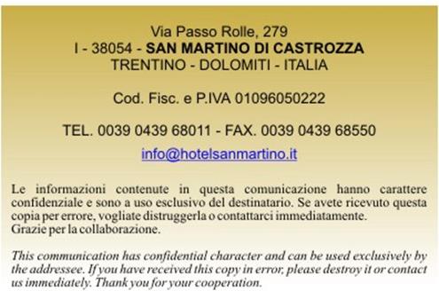 Offerta gruppi San Martino di Castrozza Dolomiti Febbraio 2017 Offerta gruppi Alla Cortese attenzione del Responsabile Vacanze Estive Le proponiamo il nostro albergo, nel cuore delle Dolomiti e del parco Naturale delle Pale di San Martino di Castrozza per una settimana nella prossima stagione Estiva 2017 Ecco la nostra Offerta settimanale valida per gruppi di min. 40 Pax . netto hotel Dal 25.06 al 02.07 Euro 320,00 a settimana netto hotel In mezza pensione bevande incluse Dal 03.09 al 10.09 Euro 320,00 a settimana netto hotel In mezza pensione bevande incluse
