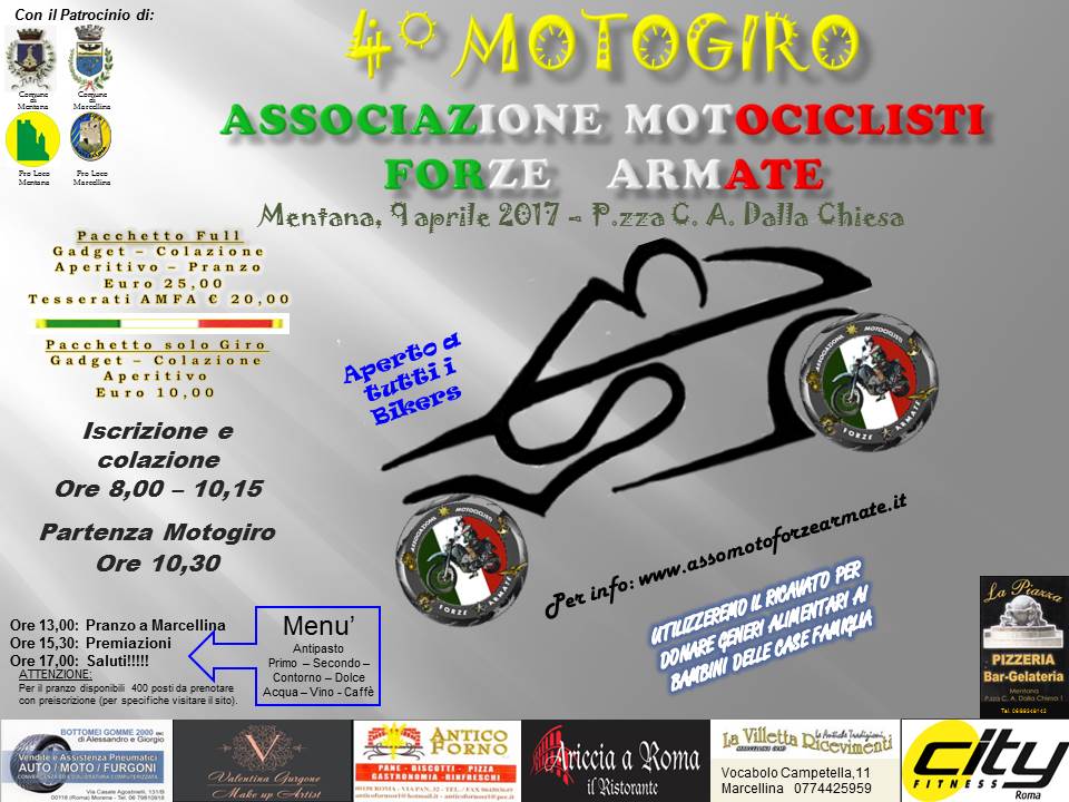 Posted: 29 Mar 2017 06:00 AM PDT Buongiorno, ISTRUZIONI ADESIONE Come per la precedente edizione sono previsti due pacchetti di partecipazione: > - Pacchetto FULL che prevede colazione, gadget, aperitivo e pranzo al costo di € 20,00 riservato ai soli Soci in regola con il tesseramento per l'anno 2017 oppure € 25,00 per i non tesserari/ospiti; > - Pacchetto SOLO GIRO che prevede colazione, gadget e aperitivo (pranzo escluso) al costo di € 10,00 Soci e ospiti. > Per quanto riguarda le iscrizioni possono essere effettuate con le seguenti modalità: > 1.a. Facendo, entro e non oltre il 06/04/2017, un bonifico sul conto AMFA (IBAN IT14H0335901600100000125839 intestato ad ASSOCIAZIONE MOTOCICLISTI FORZE ARMATE) per l'importo dovuto e con la motivazione "DONAZIONE PER PARTECIPAZIONE MOTOGIRO" e compilando contestualmente i campi sulla pagina http://www.assomotoforzearmate.it/eventi.html# . Si rappresenta l'importanza della corretta compilazione di tutti i campi e l' inoltro della copia del bonifico. Nel caso venisse scelta questa opzione, la busta contenente i gadget e i buoni per la colazione, l'aperitivo e il pranzo (se richiesto) potranno essere ritirati il mattino dell'evento. > 1.b Questa opzione è prevista anche per gruppi e motoclub; basta scaricare il modulo dedicato al seguente link http://www.assomotoforzearmate.it/eventi.html# e compilarlo allegandolo poi nel previsto campo con il bonifico relativo al numero di persone partecipanti. Anche in questo caso il referente del gruppo il mattino del 09 aprile ritirerà le buste contenenti il materiale (per tutto il suo gruppo) > 2. Presso il nostro AMFAPOINT c/o BOTTOMEI GOMME sito in via Casale Agostinelli n.131/b a Morena (Ciampino) da Mercoledì 29/03 al venerdì 07/04 (sabato e domenica esclusi). In questo caso saranno ritirati direttamente i gadget e i buoni spettanti. > 3. Il mattino dell'evento dalle ore 08.30 alle ore 10.00. > Al fine di semplificare e snellire tutte le operazioni che dovranno essere effettuate il mattino dell'evento, si invita a prediligere una delle prime due opzioni di iscrizione. > Vi aspetto numerosi. |