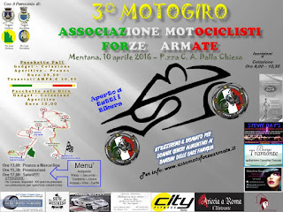 3° Motogiro Associazione Motociclisti Forze Armate - 10 Aprile 2016 Mentana (RM) Posted: 16 Mar 2016 05:48 AM PDT Spettabile Presidente, anche quest'anno avrà luogo il 3°Motogiro AMFA, giornata dedicata alla solidarietà. Ti chiediamo di poter pubblicizzare l'evento nei social e di partecipare con i tuoi amici Bikers Ti aspettiamo il 10 aprile non mancare Di seguito alcune indicazioni per effettuare le preiscrizioni che, oltre a non farti fare file interminabili quella mattina, ti assicureranno, qualora tu voglia, la prenotazione presso il ristorante. Quest' anno ci saranno molti premi .......... che aspetti ingrassa la catena e scalda il motore Per dare l 'adesione clicca sul seguente link e segui le istruzioni http://www.assomotoforzearmate.it/eventi.html# Il Presidente ANTENUCCI Francesco |