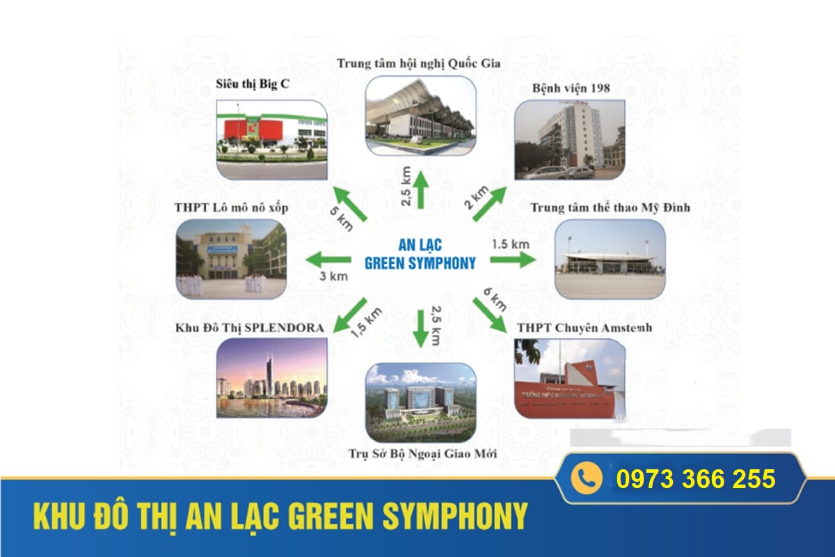 Khu đô thị An Lạc Green Symphony là một khu đô thị có vị trí chiến lược trong quy hoạch phát triển mở rộng về phía Tây thủ đô Hà Nội. Nằm sát bên đường cao tốc Láng Hòa Lạc, Dự án cách trung tâm Hà Nội khoảng 5km qua đường Văn Tiến Dũng kéo dài và đường 70 sẽ mở rộng trong đầu năm 2019 . Liên kết vùng của dự án gắn liền với các công trình lớn như Trung Tâm Hội Nghị Quốc Gia, Khu đô thị Xuân Phương, Tasco Xuân Phương Giai Đoạn 2, Dự án Vinhomes Mỹ Đình, Vinhomes Thằng Long là đầu mối phát triển của chuỗi vệ tinh của thủ đô như Khu đô Thị Tasco, Khu đô thị Bắc An Khánh.