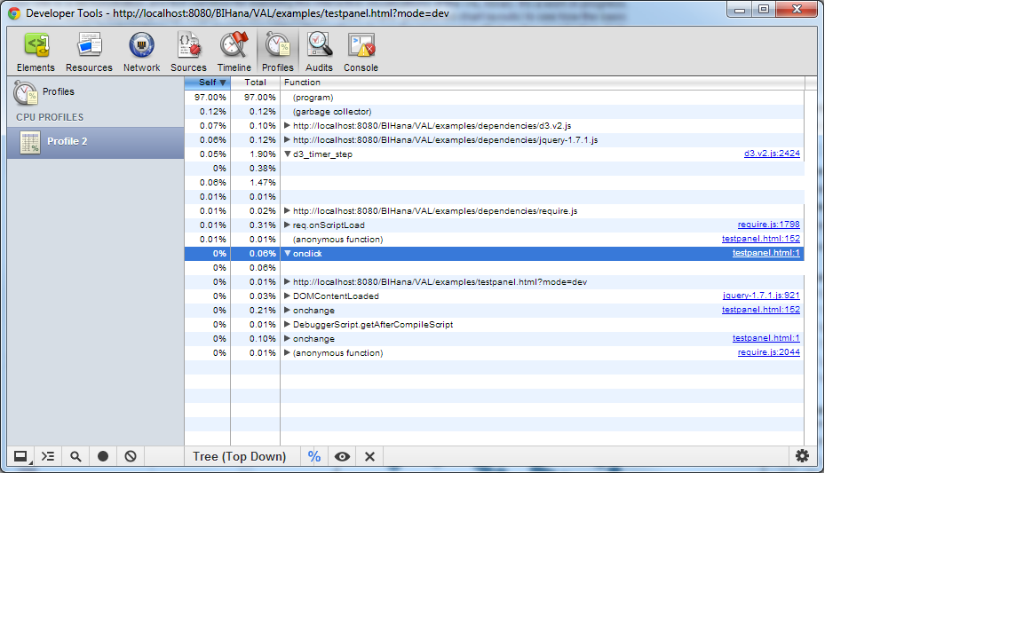 Basically, what happens is after the profiler stops it displays a list of functions in the "bottom up" view. When I click on the arrow next to any of the functions, the first click does nothing and then the second click does expand the selection but it just shows empty lines nested under the function. Sometimes there are "self" and "total" numbers next to the empty lines and sometimes not.