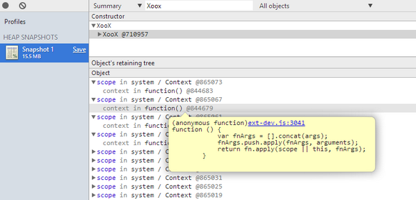 The retaining tree shows only references to execution contexts. These go back to generated anonymous functions that create a closure over the object as 'scope', and the resulting functions were then assigned as object members. The concept is more or less that of ES6 Function.bind, just non-native (from the ExtJs framework).