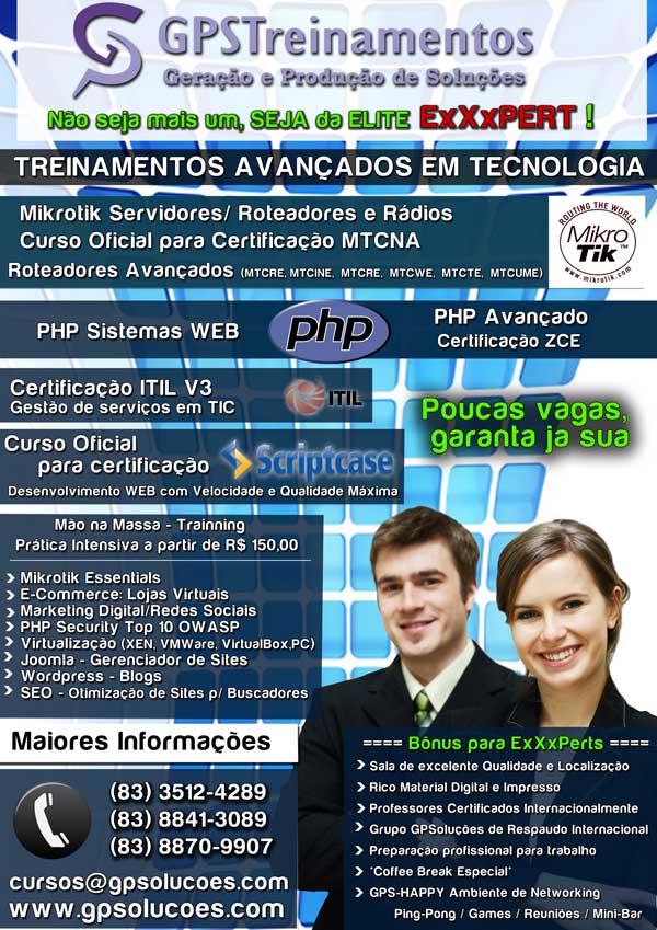 Confira nossos diferenciais (http://gpsolucoes.com/midia/cartaz_treinamentos_avancados.jpg) e não perca mais essa oportunidade única de estar no TOPO da elite profissional de TIC, Chegou a hora de investir em VOCE ou na sua equipe!