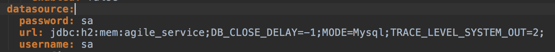 When I use spring boot framework to write spock testing,this is my appliction.yml settingdatasource: password: sa url: jdbc:h2:mem:agile_service;DB_CLOSE_DELAY=-1;MODE=Mysql;TRACE_LEVEL_SYSTEM_OUT=2; username: sa