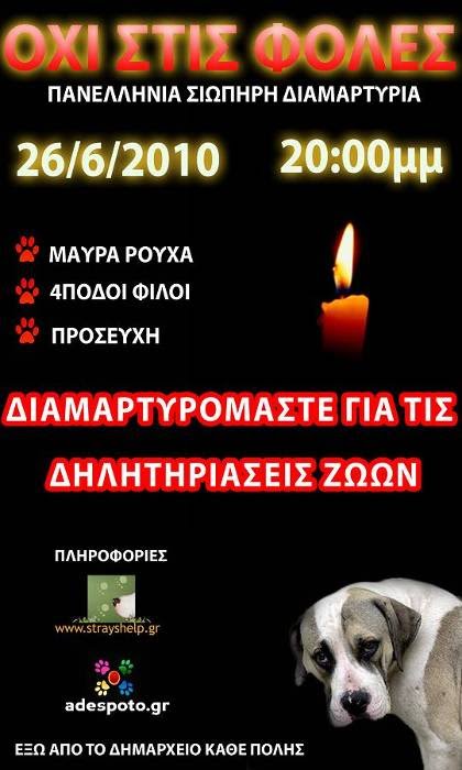 Στις 9 το βράδυ θα διαβαστούν ταυτόχρονα σε όλες τις περιοχές, λίγα λόγια για τα αδικοχαμένα ζωάκια. Όλοι οι φιλόζωοι απαιτούν: από την Πολιτεία να θεσπίσει αυστηρότερους νόμους σχετικά με το δηλητηριασμό των ζώων, από τα Δημαρχεία να τηρούν τα προγράμματα στειρώσεων και φροντίδας των αδέσποτων και από την Αστυνομία να αναλάβουν τις υποχρεώσεις τους για τις περιπτώσεις καταγγελίας δηλητηρίασης ζώων. Η απάνθρωπη αυτή τακτική εξόντωσης αδέσποτων και οικόσιτων ζώων πρέπει να σταματήσει άμεσα από οποιονδήποτε, ανεξαιρέτως. Οι τουρίστες δεν ενοχλούνται από τα αδέσποτα, αλλά από τα πτώματα! Και όλοι μαζί ενοχλούμαστε από τον πόνο που προκαλείται στα ζώα. Αν πέσει στην αντίληψή σας κάποιο τέτοιο γεγονός, κάντε άμεσα καταγγελία στην αστυνομία και ειδοποιήστε όσο περισσότερους φιλόζωους της περιοχής σας μπορείτε.