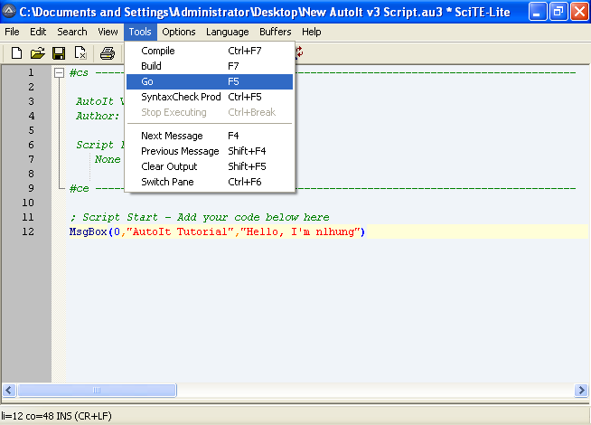 Sau khi đã tạo được cho mình một file "New AutoIt v3 Script.au3" rồi thì chúng ta tiến hành sửa code bên trong. Các bước tiến hành như sau: