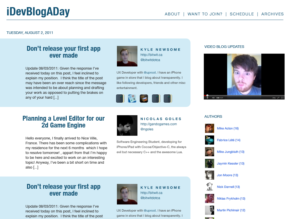 Or, we can do a twiiter status of all authors. Perhaps each author's most recent tweet with the "#idevblogadaystatus" tag shows up in an alphabetical list.