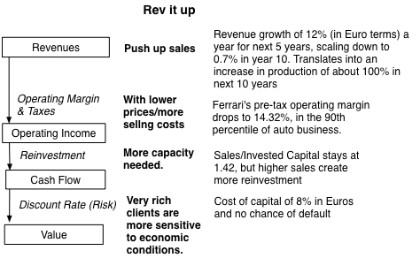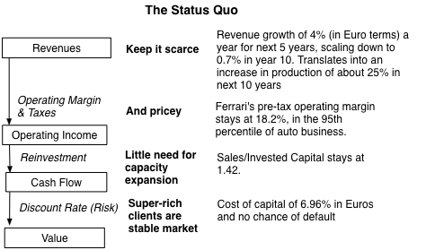 To illustrate how exclusive the Ferrari club is, in all of 2014, the company sold only 7255 cars, a number that has barely budged over the last five years. (The Lamborghini club is even more exclusive, with only 2000 cars sold annually.) The company has its roots in Italy but is dependent on a super- rich clientele globally for its sales: Note that a significant slice of the revenue pie comes the Middle East and that Ferrari, like many other global companies, is becoming increasingly dependent on China for growth. Valuing Ferrari As many of you reading this blog are aware, I am a believer that all valuations start with stories and that different stories can yield different valuations. With Ferrari, there are two plausible stories that you can offer for the future of the company, with valuations to back them up: 1.The Status Quo (Super Exclusive, Low Production, High Margin) The story: Ferrari remains a extra-exclusive automobile company, keeping production low and prices high. The benefits of this strategy are high operating margins (Ferrari has among the highest in the auto business) partly because of the high prices, and partly because the company does not have to spend much on expensive ad campaigns or selling. It also will keep reinvestment needs to a minimum, since capacity expansion will not be necessary, though the company will continue spending on R&D to preserve its edge (on speed and styling). In addition, by focusing on a very small group of super rich people around the world, Ferrari may be less affected by macroeconomic forces than other luxury auto companies. The inputs: The inputs into my valuation reflect the story, with low revenue growth, high margins and low reinvestment driving value: The valuation: With these assumptions, the value for equity of 6,310 million Euros (approximately $7 billion). You can download the spreadsheet here. 2. Rev it Up (Increase production, Introduce a lower-priced model) The story: Ferrari tries to broaden its customer base, perhaps by introducing a lower-priced version; this would mirror what Maserati did with its Ghibli model. That will allow for higher revenue growth but like Maserati, Ferrari will have to yield some of its operating margin, since this strategy will require lower prices and higher selling costs. Seeking a larger market will also expose it to more market risk, pushing its cost of capital in high growth to 8.5% and its cost of capital beyond to 7.5%. The inputs: This strategy will generate higher sales (doubling number of units sold in next ten years) but at the expense of lower margins (from lower prices and higher selling costs) and higher risk (as the clientele will be more sensitive to economic conditions). The valuation: With this strategy, the value for equity of 6,042 million Euros (approximately $6.75 billion). You can download the spreadsheet here. At least based on my estimates, it is more sensible for Ferrari to stick with its low-growth, high price strategy and keep itself above the fray of the auto business, a bad business where most companies seem to have a tough time earning their cost of capital. The Brand Name Premium There is a lot of casual talk about how Ferrari will command a premium because of its name and some have suggested that you should add that premium on to estimated value. In an intrinsic valuation, it is double counting to add a premium and the reason is simple. The values that I have estimated already incorporate the premium. If you are wondering how, take a look at the operating margin of 18.20% that I have used for Ferrari, a number vastly in excess of the margins earned by other auto companies. That high margin, in conjunction with limited growth in cars sold, also allows Ferrari to earn a return on capital of 14.56%, well above its cost of capital. These inputs yield a value premium, with the magnitude varying across multiples: