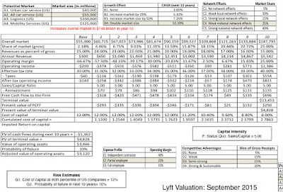 Dream Big or Stay Focused? Lyft's Counter to Uber! Posted: 19 Oct 2015 04:04 PM PDT This is the second in a series of three posts on the ride sharing business. In my first, published in both TechCrunch and my blog, I valued Uber, trying to incorporate the news that has come out about the company and its competition in the last year. In this one, I first turn to valuing Lyft, which is telling a narrower, more focused story to investors than Uber and also look at how the pricing ladder in ride sharing companies has pushed up prices across the board. In the last post, due out on Wednesday, I will look at the ride sharing market as a business. In my last post, I valued Uber and admitted that the company has made its way to my list of obsessions. My focus on Uber, though, has meant that I have not paid any attention to the other ride sharing company in the US, Lyft, and I don’t think I have been alone in this process. An unscientific analysis of news stories on ride-sharing companies in the last couple of years suggests that Uber has dominated the coverage of this business. Rather than view this as a slight on Lyft, I would argue that this is at least partially by design, and that it is part of both companies' strategies. Uber is viewed as the hands-down winner of this battle right now, but this is just one battle in a long war and investors define winners differently from corporate strategists. Valuing Lyft To value Lyft, I will employ the same template that I used for Uber, though the choices I will make in terms of total market, market share, operating margins and risk will all be different, reflecting both Lyft’s smaller scale and more limited ambitions (for the moment). The Leaked NumbersThe place to start this assessment is by comparing the ride sharing reach of Lyft with Uber and that comparison is in the table below: