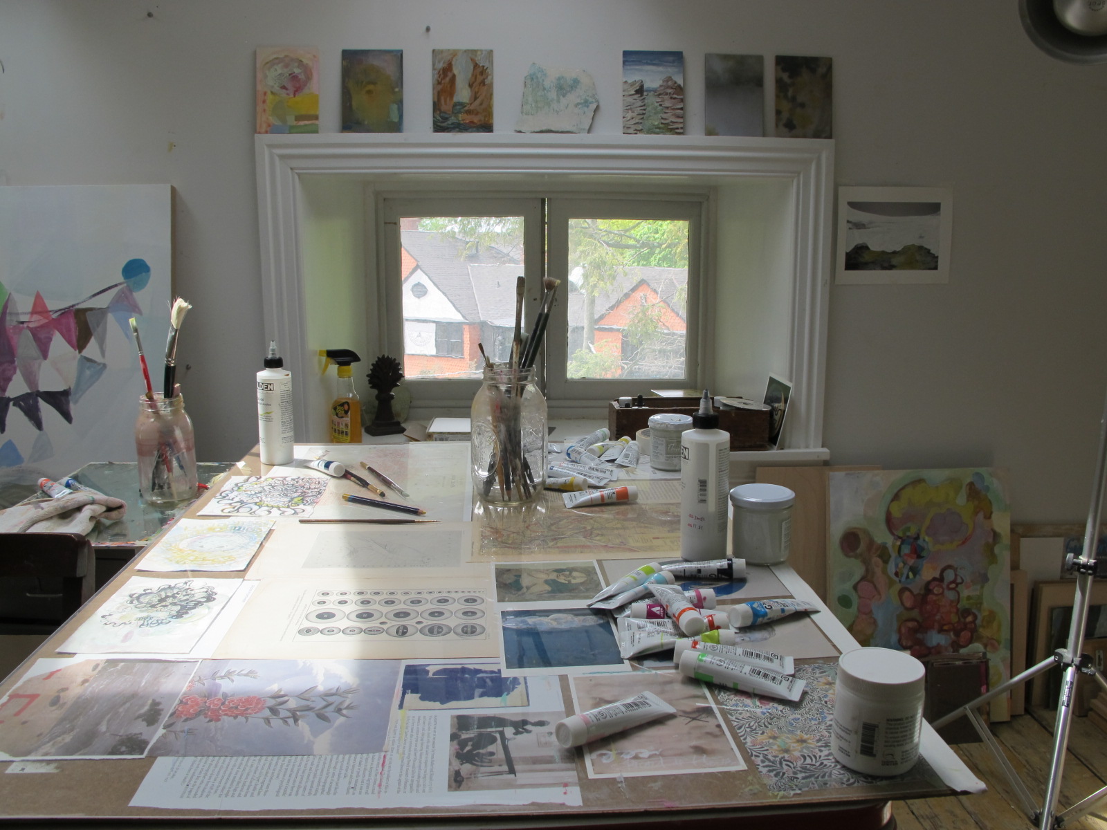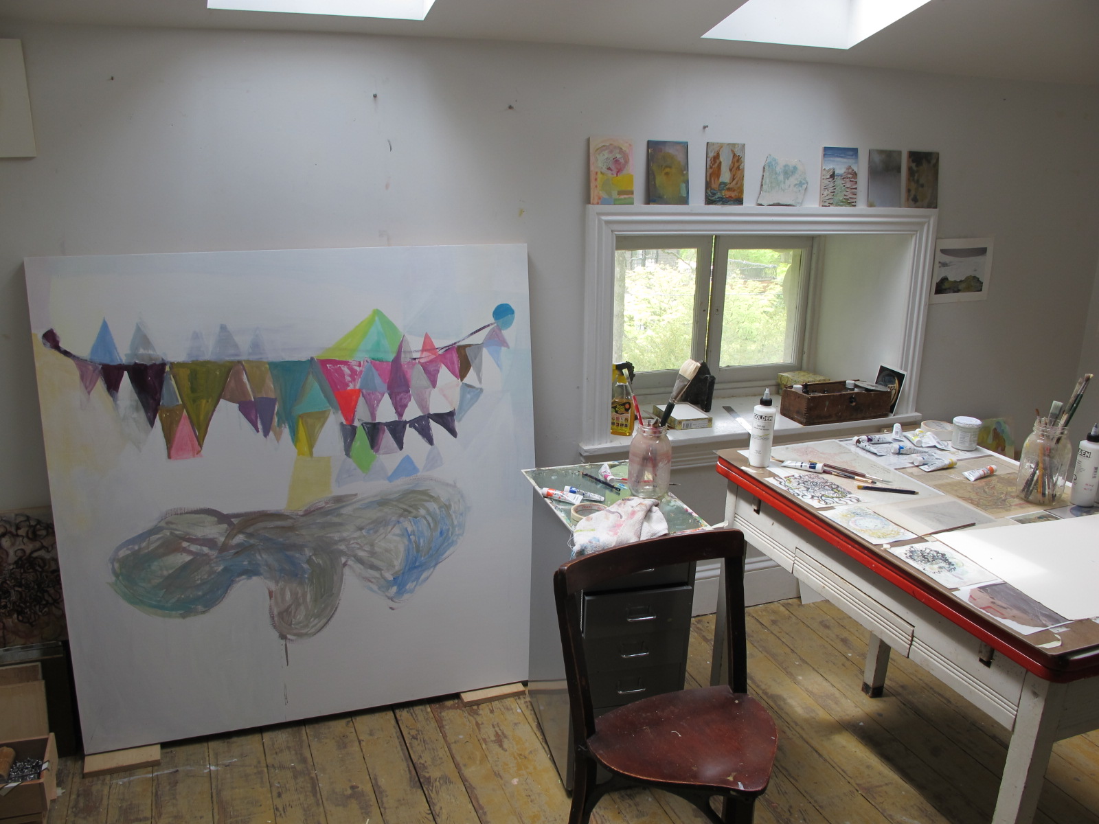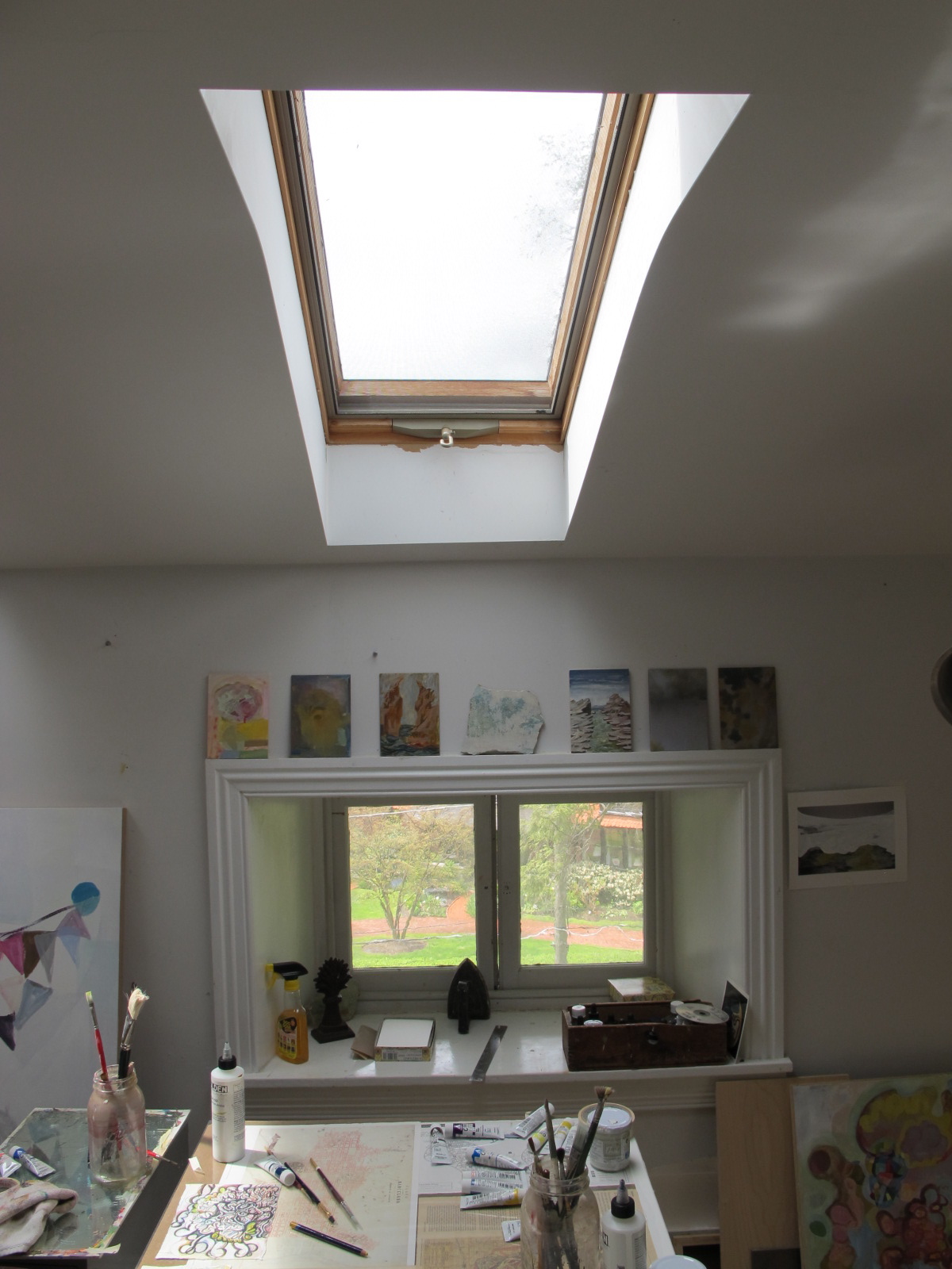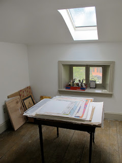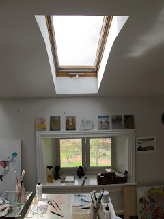 home tour of Phildaelphia painter Bonnie Levinthal's perfectly appointed and gracious Chestnut Hill home. Tucked away on the third floor is her painting studio, the jewel in the crown if you ask me in a home chock full of jewels. Not only because of its glorious light, but because it reminds you of a European pied de terre, simple, humble, and utterly perfect for the serious work of artists. As a fine art photographer specializing in large scale silver portraits, I have always envied my painter friends toiling away in daylight while I slogged it out in windowless darkness. Ok, the darkroom red light is pretty captivating as is all the running water, but ten hours in a darkroom suspends time, oddly, while ten hours in a painters studio allows the unfolding of light, how it moves through the day, changing color and intensity, its own kind of miracle. Bonnie's work has always been (among other things sensual and psychological) a treatise on light. Light as atmosphere, light as form, light transforming land, and light illuminating psychological vagaries of the mind. You can see more of Bonnie's work and follow her log by clicking