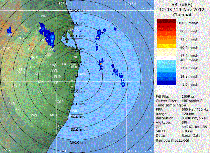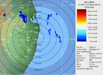 4:45pm, Satellite IR with IR temperature shows good convective activity around the core of the system. Moved S-W during the past 12hrs. Moving slowly to as it is expected with a LOW system. Pressure is still around 1004mb. Winds upto 45km/hr. Landfall of the system is expected near Chennai in another 18 to 24hrs. Heavy Rains with Winds gusts expected along S.Andhra coast, Chennai and N.Tamilnadu coast within next 12hrs.