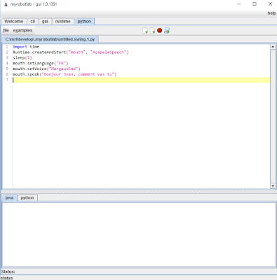------Traceback (most recent call last): File string, line 15, in moduleAttributeError: org.myrobotlab.service.AcapelaSpeech object has no attribute setGoogleURI at org.python.core.Py.AttributeError(Py.java:205) at org.python.core.PyObject.noAttributeError(PyObject.java:1013) at org.python.core.PyObject.__getattr__(PyObject.java:1008) at org.python.pycode._pyx31.f$0(string:52) at org.python.pycode._pyx31.call_function(string) at org.python.core.PyTableCode.call(PyTableCode.java:167) at org.python.core.PyCode.call(PyCode.java:18) at org.python.core.Py.runCode(Py.java:1386) at org.python.core.Py.exec(Py.java:1430) at org.python.util.PythonInterpreter.exec(PythonInterpreter.java:267) at org.myrobotlab.service.Python$PIThread.run(Python.java:177)------Bonjour,