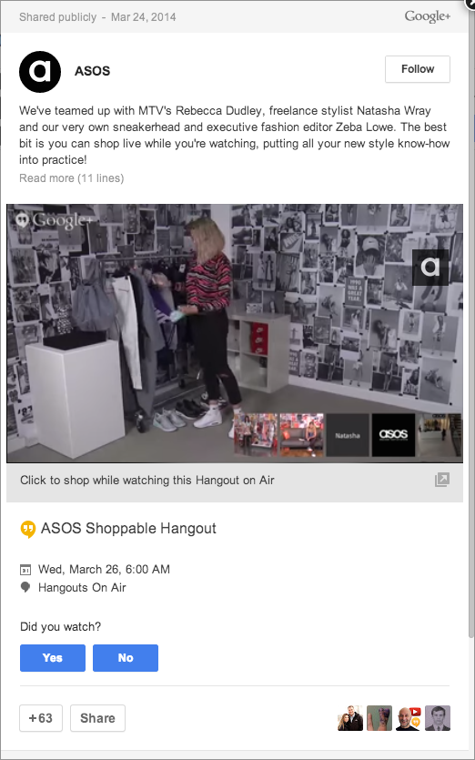 Mit Anzeigen aus Google+ Beiträgen, die Nutzer zu bestimmten Aktionen vor, während und nach dem Event auffordern, können Sie mehr Aufmerksamkeit auf Ihren Hangout On Air lenken. Nutzer können vor dem Hangout auf Einladungen antworten, die Übertragung live erleben und nach Ende des Events eine Aufzeichnung ansehen.