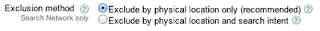 We hebben ook de geavanceerde uitsluitingsmethoden voor locaties gewijzigd. Eerder was de minder beperkende optie 'Alleen uitsluiten op basis van fysieke locatie' de standaardoptie. Op basis van feedback van adverteerders hebben we de uitsluitingsopties in andere bewoordingen uitgedrukt en de meer beperkende optie 'Gebruikers die zich bevinden in, op zoek zijn naar of pagina's weergeven over mijn uitgesloten locatie' ingesteld als de standaardoptie. Zo kunt u voorkomen dat u vertoningen genereert voor uitgesloten gebieden, ongeacht of uw klanten zich bevinden in of zijn geïnteresseerd in die gebieden.