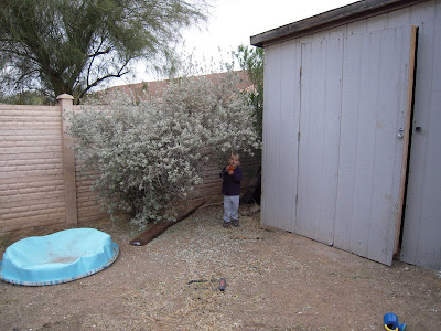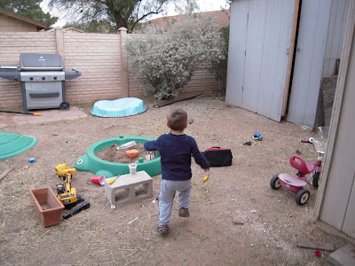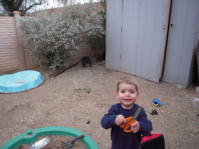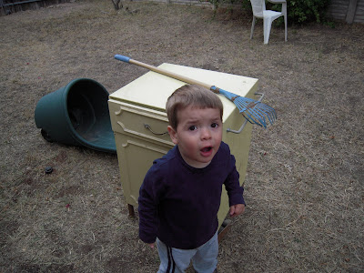 Jameson took to playing with it right away. Several garden tools are hiding inside, and he was trying to tell me what the rake was for, but he got distracted.