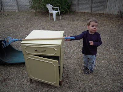 Last week I replaced the faucet on my bathroom sink, and want to make a new play kitchen for Jameson. We went to a thrift store today, I was hoping to find a bookshelf or something similar to use as the base (since cardboard didn't work too well before!)