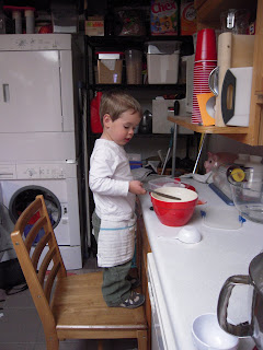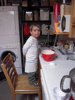 Jameson loves helping me in the kitchen, especially when I give him some of the ingredients I'm using. He helped make cookies yesterday. I tucked a towel into his pants as an apron, and he took to the roll of chef quite well.