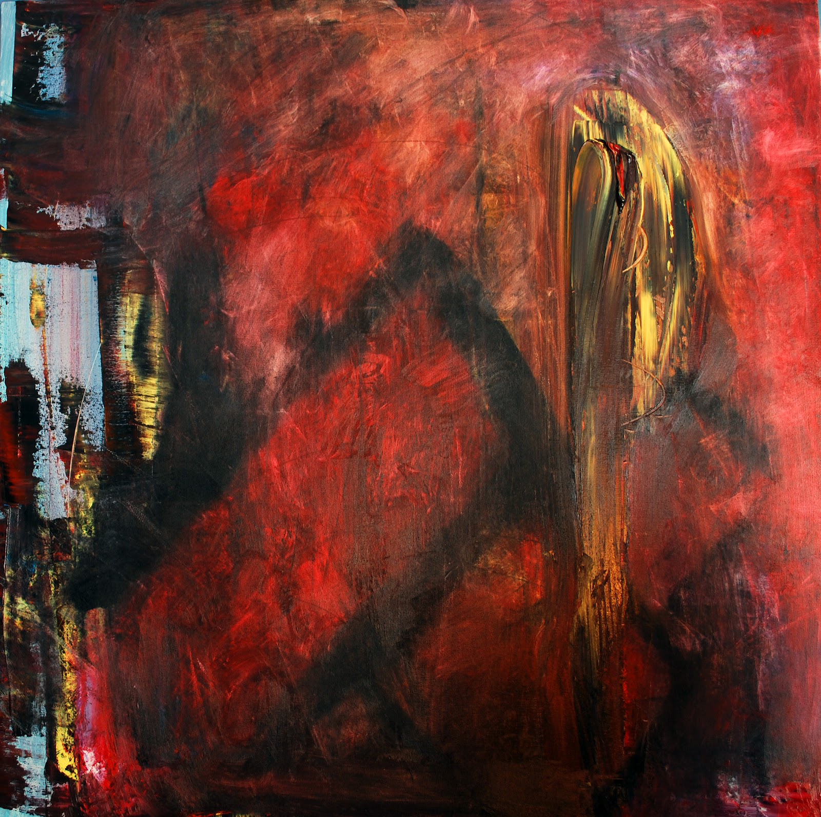 I felt the painting was unfinished and I was unsatisfied with it. I therefore brought it to my home studio and proceeded to lighten it. If you look closely you may be able to see the charcoal lines beneath the paint. I tried to preserve some of the elements of the painting. See the blue on the left and the yellow shape on the right.