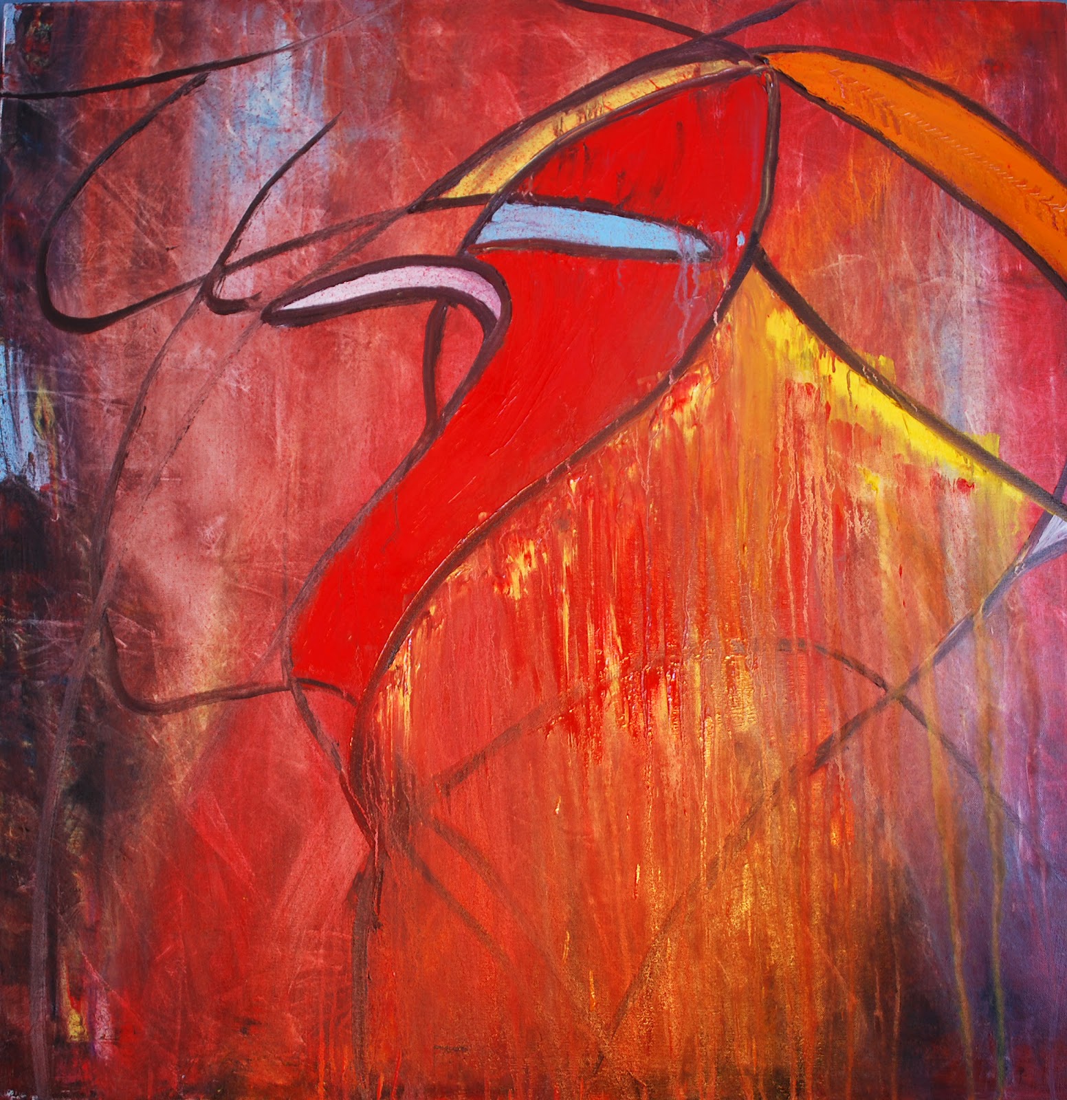 At a weekly Toast- masters meeting, I painted a live, action per- formance painting and gave a pre- sentation along with it. Because there was so much audience interaction, I was unable to finish. I started with a white canvas, 36x36 on which I drew some haphazard lines with charcoal. I concluded with the painting you see here.
