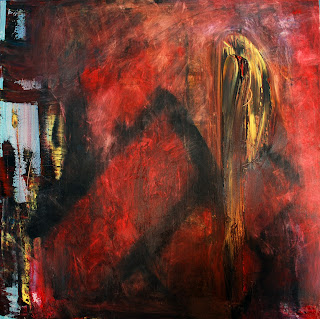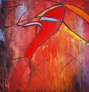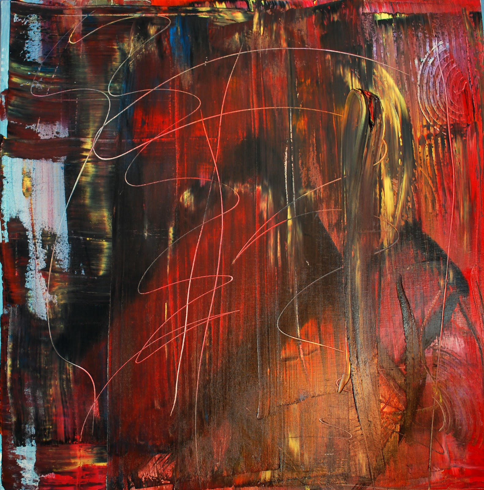 Tada! The finished painting became a chameleon as it went through several changes. Note that I used scraping, dripping, and texturing to create....