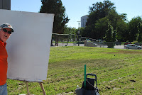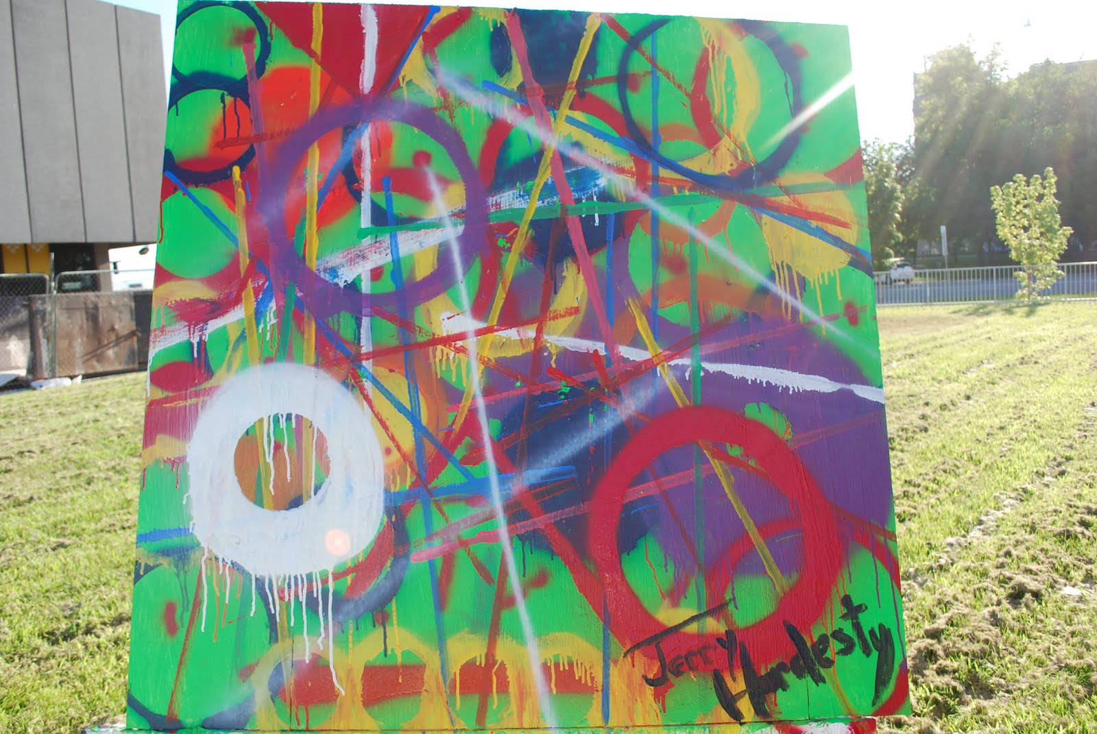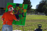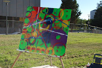 I painted "Circles" for Salt City Artists' League. The League's mission is to bring the arts together and to develop and provide more venues for artists. The League has sponsored an arts festival during the first three week-ends in August at Library Square in downtown Salt Lake City. Plywood sheets painted white, size 48x48, were provided. The League provided some latex paints.