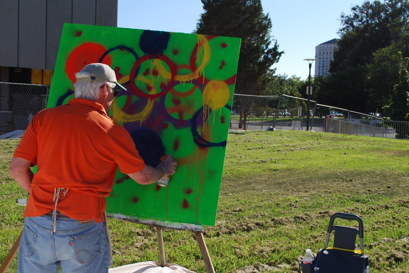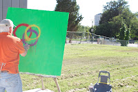 I painted the substrate an acrylic green and began spray painting circles.