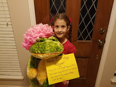 Our sweet neighbor across the street knows that Abigail LOVES all things frog (she has several frogs in her garden). We came home from school one day recently and this was sitting on our porch. Abigail doesn't look too excited in the picture, but she jumped for joy and then carried Sir Ribbit Bibbit (as she named him) around the house for 2 days straight.