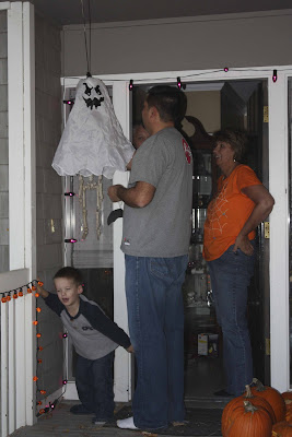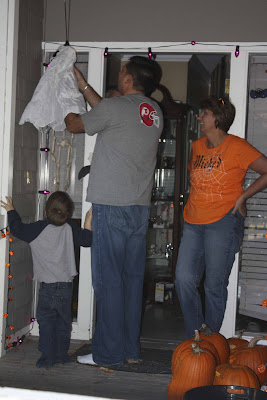 Getting ready for the trick or treaters. If you clapped or made a loud noise, the ghost would swing towards you on the wire. Jayson always has so much fun making our porch all Halloween-y.