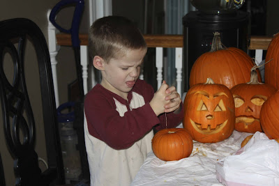 Hudson and his first pumpkin of the night. He carved it without ANY help
