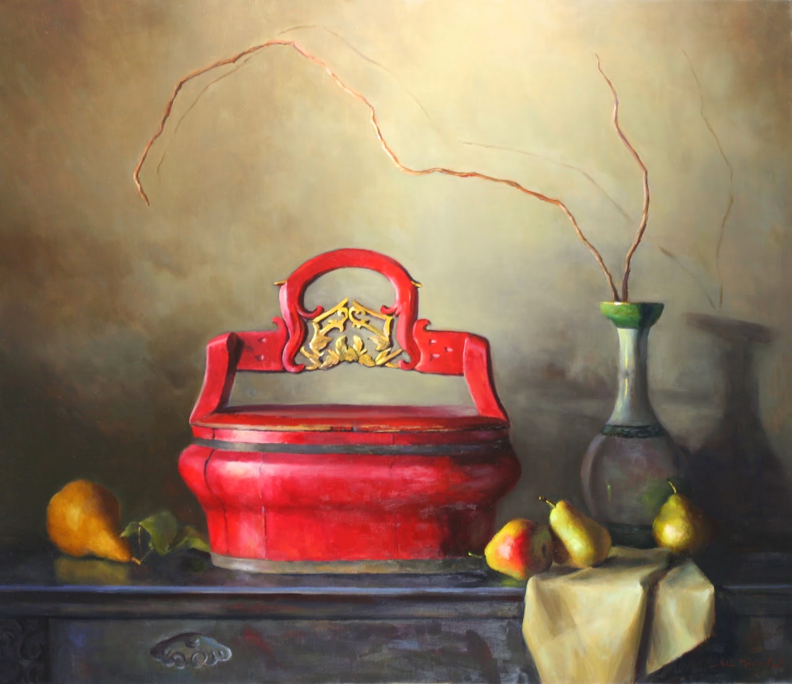 I completed this painting recently, and want to thank my friend, Scotty, for loaning me her beautiful antique Chinese lunch basket. The basket is two hundred years old and so elegant. Imagine using it to carry your lunch! The intricacies of the detail were challenging to draw, but I hope I was able to capture its grace and magnificent red color. I am loving red these days!