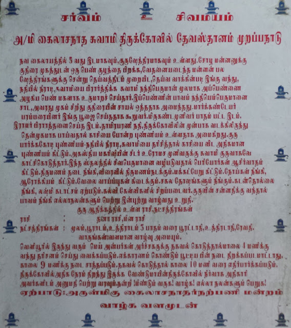 சோழ மன்னனின் மகள் குதிரை முகத்துடன் பிறக்க, அதன் பாவ நிவர்த்தி வேண்டி சோழ மன்னன் ஒவ்வொரு சிவத்தலங்களாக சென்று பரிகாரம் செய்ய வேண்டி இத்தலம் வந்து, இங்குள்ள தாமிரபரணி நதியில் நீராடி, கைலாச நாதரை வேண்ட , அவர் பாவ விமோசனம் அளிக்க நந்தி எம் பிரானிடம் கூற அவர்மூலம் பாவ விமோசனம் பெறும் போது, மன்னன் மகளின் பாவங்கள் கழிய குதிரை முகம் மாறி வரும் போது, அதன் அடையாளமாக நந்தியின்முகம் குதிரை முகமாக மாறியதாம், மன்னன் மகளின் முற்பிறவிப் பாவத்தை நந்தி ஏற்றுக் கொண்டதாம். எனவேதான் நந்தி குதிரை முகத்தோடு காட்சியருள்கிறார்.