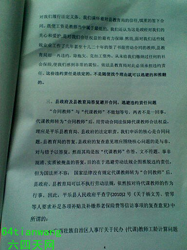 Posted: 24 Mar 2012 09:37 AM PDT 作者:义工黄琦 | 来源:六四天网 【天网云南讯2012-03-22】今天中午,广西省桂林市平乐县在职教师杨文芳致电中国天网人权事务中心:我们25位教师参与维权,1人遭劳教。 杨文芳老师说:我们是一个教师维权群体,在职教师20人,待岗教师五人。1995年12月,我们与平乐县教育局签订劳动合同书,从08年开始我们就合同问题,向平乐县教育局、以及各级政府部门逐级反映,要求教育局履行合同约定的义务。我们得到的答复均是撇开合同,称我们是临时工。我们于无奈之下只好走上司法程序,满以为法院会给予我们一个公正的判决。我们在2009年2月递交诉状到平乐县法院,开始我们说请不起律师,自己出庭,法院发了4月15号的开庭告知书,4月6号我们请来了律师,法院则在4月7号就通知我到法院拿裁决书,我问及其他人的呢,法官说:“你告诉他们过几天来拿,现在还没弄好。”杨又问为什么不开庭了?法官说:“上头有指示,不开庭了。” 据悉,杨文芳等20多人陆续拿到平乐县法院的裁决书。在拿到10天后及时递交上诉到中院的诉状,一个月后,杨文芳问及桂林市中院,我们的诉状现在结果怎样?却被告知还没有送上来,还在平乐县法院。 事态的进展,促使老师们开始了进京上访。以后每年上访一次,法院的裁决书就很快下来。从09年至今,老师们已经去最高法院申诉了6次,也到国家信访局六次,但其诉求并未解决。 2012年2月21日晚,当局以管琴老师上访为由,将其送进平乐县拘留所,2月29日则被送往广西自治区南宁女子劳教所教养一年。3月5号,杨文芳等5名教师在久敬庄被县里接回,3月21日,地方派出所已是第三次找我们做笔录,说是这次的笔录要报送桂林市公安局,由市局决定对我们的处罚。 目前,参与维权的其余教师们担心遭桂林当局拘留、教养。 |