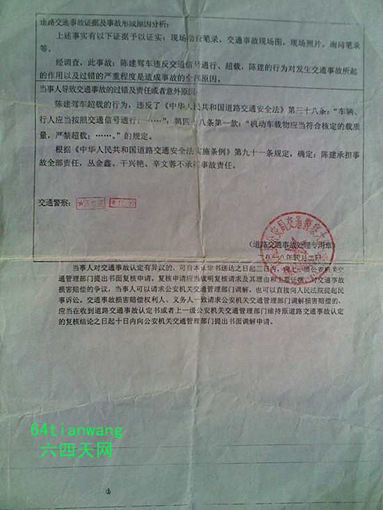 Posted: 24 Mar 2012 11:47 PM PDT 作者:义工黄琦 | 来源:六四天网 【天网成都讯2012-03-25】今天上午,成都市双流县金岛社区辛文蓉前往中国天网人权事务中心:成都市政府进京截访造成交通事故,官方不愿承担相关责任。 据双流县金岛社区辛文蓉介绍:2010年3月6日她与双流县街办干兴艳被双流县政府工作人员截访并交给北京五黑保安(丛金鑫,驾驶京PJQ131号“福田牌”小型普通客车)押回,在成都市双流龙桥路口发生交通事故,双流县访民辛文蓉、干兴艳均受伤。 双流县公安局交通警察大队随即在《双公交认字【2010】第6—0277号认定书认定:陈建驾驶川A71722号“陕汽牌”重型货车担任全责,陈建不服要求复核,成都市公安局受理,并责令双流县公安局交通警察大队重新认定,但双流县公安局交通警察大队至今没有重新作出认定,交通事故一案得不到解决。 2012年1月8日,辛文蓉提起行政复议;2012年3月20日,辛文蓉收到成都市公安局答复:我局决定,驳回申请人的行政复议申请,辛文蓉和干兴艳均感到奇怪:为什么成都市公安局出尔反尔。 |