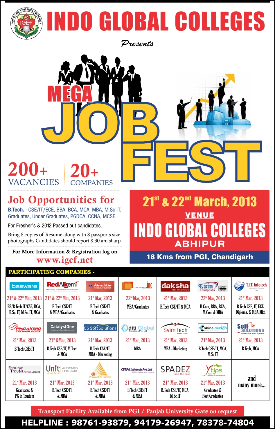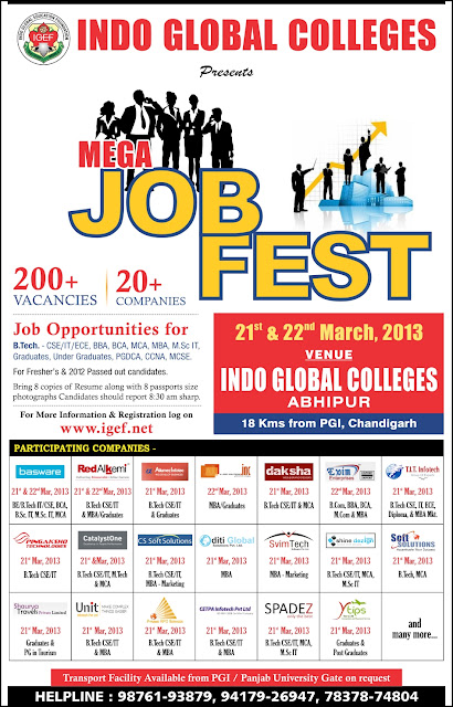 MEGA Jobfair for Freshers in Punjab - on 21st and 22nd March 2013 | Fresherschoice Posted: 19 Mar 2013 06:38 AM PDT