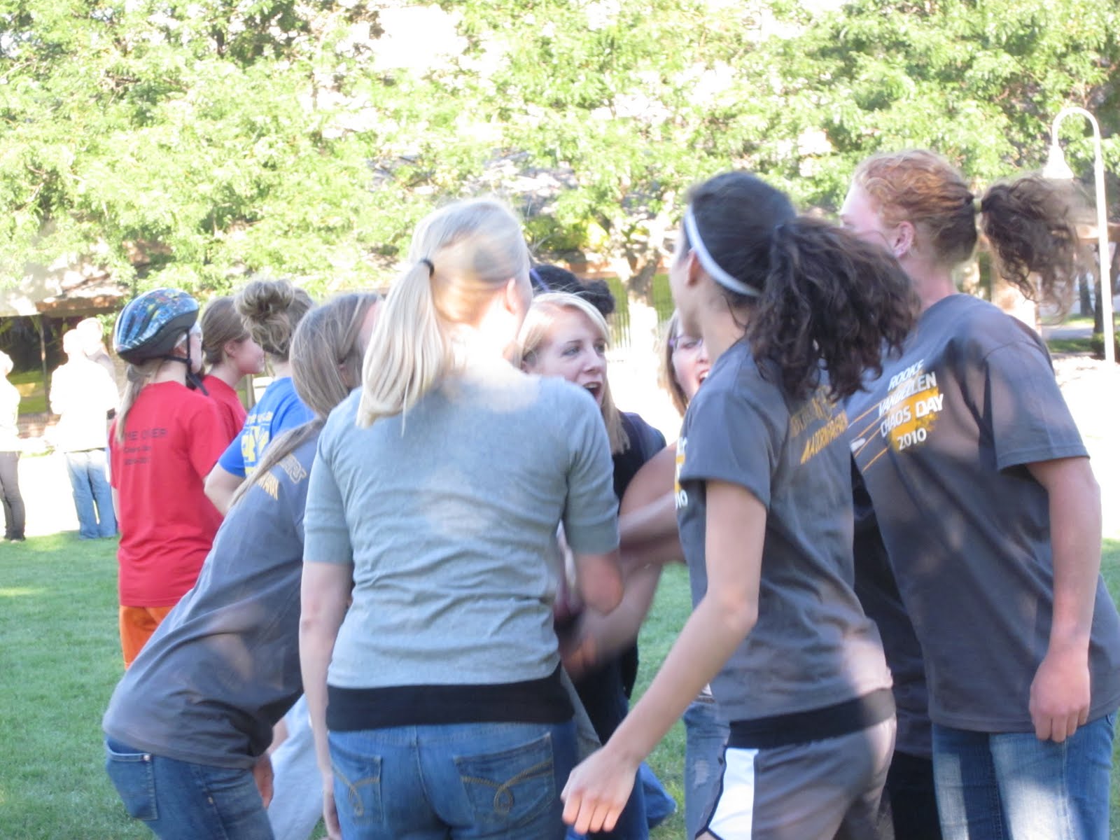 Us girls in a huddle, discussing our plan to win!